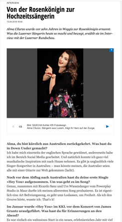 Nach meinem Australien Aufenhalt durfte ich in der Luzerner Rundschau ein Interview geben: Von der Rosenkönigin zur Hochzeitssängerin. Wir sprachen über meine Reise nach Australien, Hochzeiten, Songs & meine neue Single Hey You.